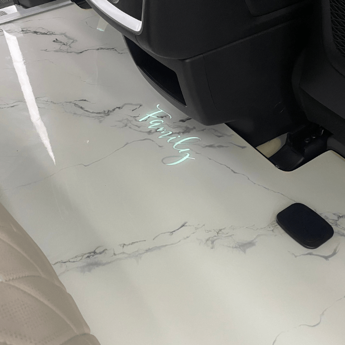 Nội thất xe với phiên trắng tinh khôi, anh chủ xe đã lựa chọn nâng cấp tất cả các chi tiết từ ghế, sàn đều là màu trắng. Đặc biệt, cặp ghế Limousine chọn kiểu may họa tiết hình thoi đan xen nhau, sang trọng làm nổi bật nội thất bên trong xe. Đã có cặp ghế Limousine, không thể nào thiếu được sàn vân đá do chính những chuyên viên kỹ thuật tại Phoenix làm thủ công, màu sắc cùng được đồng bộ với xe là màu trắng kèm theo đó là những đường vân đen, xám là điểm nhất cá tính mà chủ xe mong muốn.